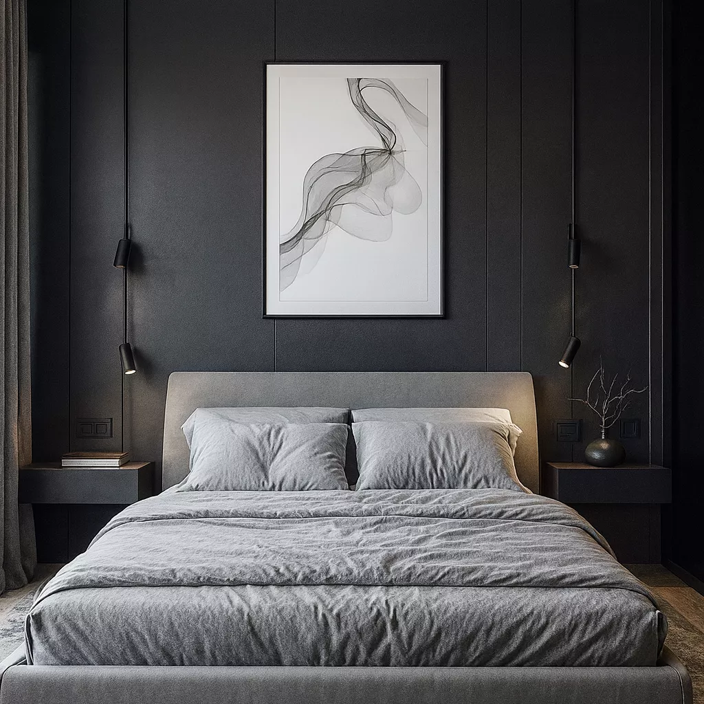 Дизайн спальни для мальчика 24 м² в Минске. Современный интерьер в монохромной палитре с рабочей зоной у окна, мягким освещением, 3D-панелью у изголовья и продуманной эргономикой для отдыха, учебы и повседневного комфорта.